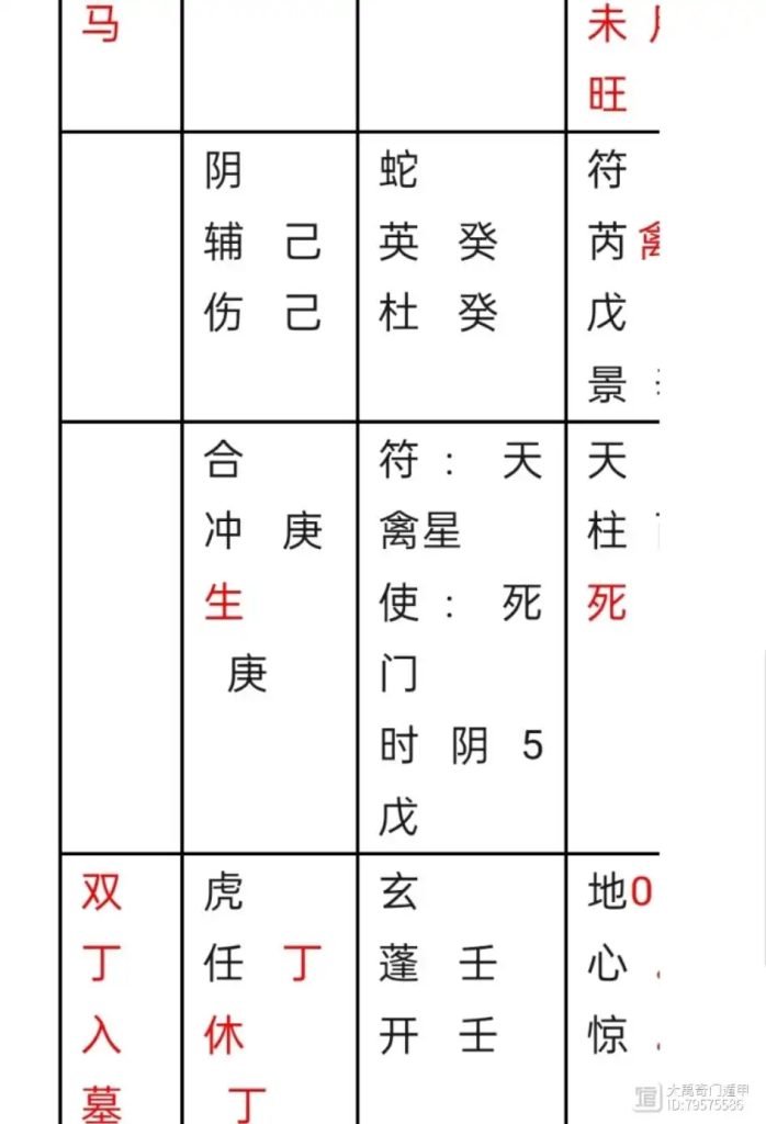 E、日干辛金落二宫,帝旺之地;辛+辛叫“伏吟天庭”,此格主为事自破,进退不果,是一大堆错误在一起,这个错误是自己造成的怨不得别人;辛+戊叫“困龙被伤”,指妄动必会带来灾殃;戊+午叫“青龙伏吟”,凡事闭塞 ,静守为吉;戊+辛叫“青龙折足”,测出行容易腿脚受伤,测事情要夭折、半道有折损,要破财。临值符、天芮星、景门预示着这些出国的消息有问题,不是好事。值符在此宫,有逢月令,足见此宫信息的重要。