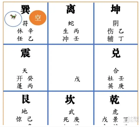 2、工作单位以开门为用神,开门落在震宫,五行为木。上乘九天,代表远走高飞。临天蓬星,凶星。格局方面:庚+丙,“贼来格”,占贼必来,以固守为好,为凶格。开门+伤门,变动、迁徙、更改,事皆不吉。开门+庚,道路阻隔,官讼是非。再来看开门旺衰情况,这涉及到八门旺衰的知识点,在月令甲寅月,开门五行克寅木,为我克者,囚。在处宫上,也是开门克落宫,囚。开门无论是月令还是处宫都是休囚的状态。大禹风水