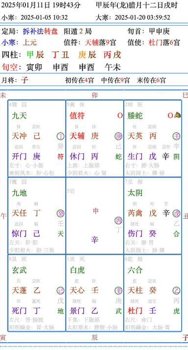 求测者女辛年主客法,六亲戊父亲主要信息!根据奇门九宫脉法兑为右关脉,为气,为脾胃!又天芮落宫在兑7宫,戊为胃!所以定落脏为胃!六经兑上乘太阴为太阴肺!宫内戊下临癸有水!给予芩桂术甘汤!又戊癸合格,合为堵,关脉堵,定为痞症,给予半夏泻心汤!戊父乘天芮星旺运气暂时没事!