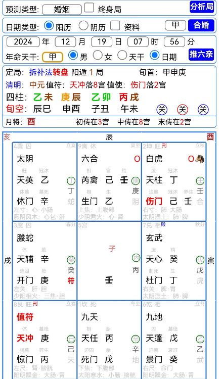 婚姻占乙为女方目前状态,生六合,说明求测人很想结婚。但是庚为男,有惊门、冲星,说明男的为这事担惊、害怕、着急,庚下临丙,男女不一心,同床异梦,庚加丙麻烦坏事来了,说明男的出现了麻烦, 乙落4宫遇乙加辛龙逃走,可能女的现在并不和男的在一起,辛主错误,女的犯了错误,休门,休息,太阴为暗地里,犯了这样的错误,暗宫乾宫戊加癸,戊入墓和钱有关系!感情状态乙4宫克庚8宫,女方最终对男不满!8宫为男的年命宫,女方壬六合主婚姻缘,落空,谁落空谁有问题,虽然想生!另外,值使落2宫空亡,有始无终,他俩不会有结果。