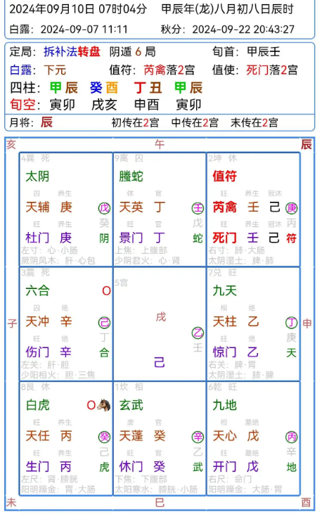 在择日克修造时间选择甲辰年八月初八辰时动工即可!这个日课虽然是个伏吟局,但是妙在坐方丁为离九宫丁加丁为十干克应最吉为文书至喜事随心,为奇门中最吉格局!在这一时辰中2个小时内,我告诉他,当你到祖坟后拜祭后然后不要着急动土,当你看到有瘸腿人或者瞎眼的人经过或者穿红衣服女人经过或者找你们问路时再动土!后他反馈遇到了一个瘸腿的红衣妇女问路!他们就动土修造!他说老师您怎么知道的!在这里我用到了三奇克应和九星值时!重用这个三克应叫乘龙万里,3个月内会发发财后代子孙,当你看到克应某些事物证明进入奇门最佳时空要应验!