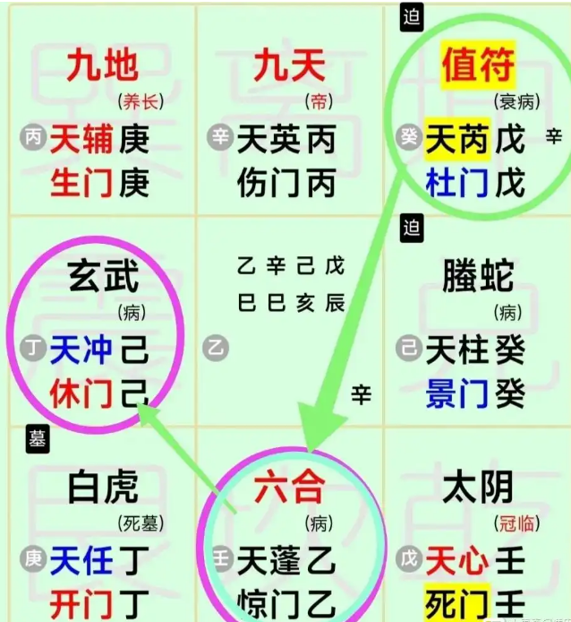 六合生日干己,大吉。己克值符,半吉。值符克六合,半凶。