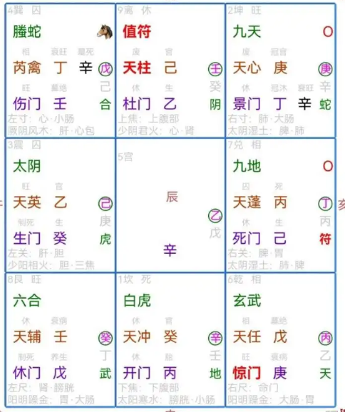 癸克丁为虚位,正好和天芮一起说明病症,腾蛇压力精神方面,丁为心脏,壬水击刑说明心脏供血,大禹风水