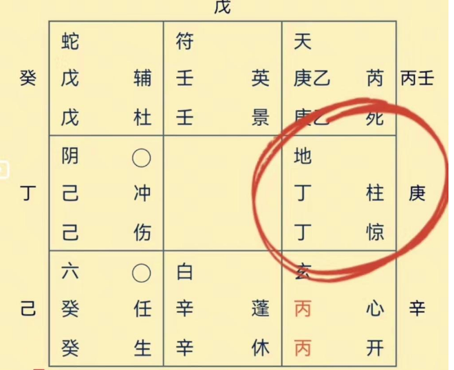 这个日干是天干——丁,就是代表他本来在兑金宫这个宫位,代表他的状态。从象意上看,这里面有九地,丁加丁,天柱星加惊门。可能大家你们看到这,会都感觉无从下手。先看这个落宫,兑金宫代表了口舌、说话,日干落兑金宫代表了从事教育行业说话。天柱星也代表了大声说话,惊门也代表了说话。一般有两个相同的象意,就可以基本确定,有三个一样的象意,就可以肯定了。