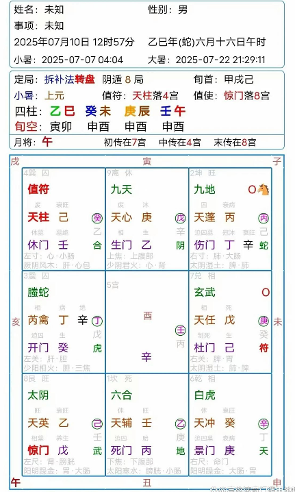 又年命对面兑七宫空亡,逢孤击虚,又是明宫暗宫有共同信息!宫内有戊胃,己脾,又是奇门九宫脉法的右关脉脾胃中焦,兑宫空说明中气不足,是补中益气汤!以上根据奇门遁甲时空模型很快利用奇门经方辩证学习锁定经方,感叹民间高人智慧!