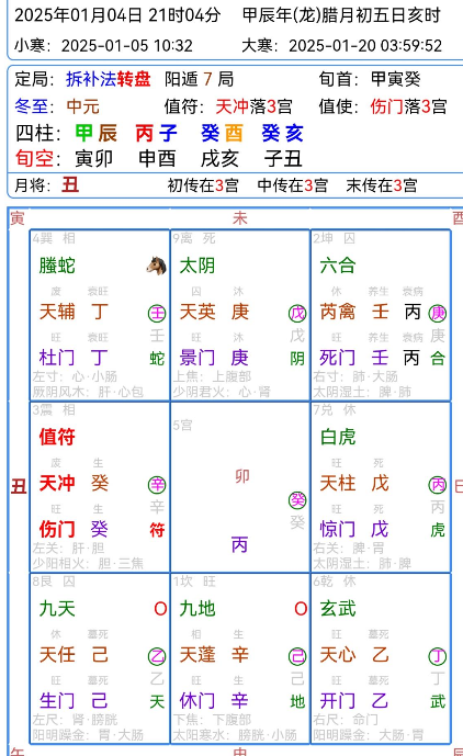 求测者戊年天盘落兑7宫,这是一个伏吟局拖拉时间长,也需要时间恢复!兑7宫为六经太阴湿土肺,得白虎金,惊门天柱金在子月旺,则不断定肺气机有问题,旺则没事!对宫震3宫癸加癸,天干辩证癸为太阳病呼应!又坎宫为太阳寒水落空,得辛肺,坎宫先天宫在兑命宫,又天芮星落坤2宫有壬肾阳,坤的先天又在坎宫,也就是说此人肾阳根本在坎1宫,年命先后天根本也在坎1宫!坎宫空,断此人营卫气血调和出现问题!给予坎宫基础用法,桂枝汤!尤于求测者在国外,告知一些基本常识!此人很不解说,别的中医说气血不足大补都是,而你只是几味药就可以了!回答说:在于辩证,找到关键,大道至简!