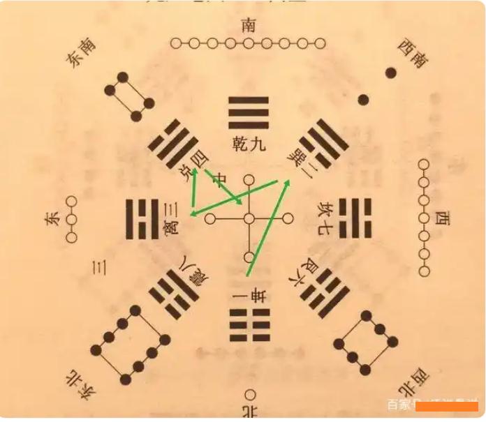 我们来看先天八卦,乾父居南,阳气以生,降而生物,所以乾卦一索而生长男,震卦在东北。二索而生中男,坎卦在正西。三索而生少男,艮卦在西北。阳老而归息于中宫。看上图,这不就是九宫飞星从中宫飞出的前半段吗?只是数和序都是逆回中宫而已。